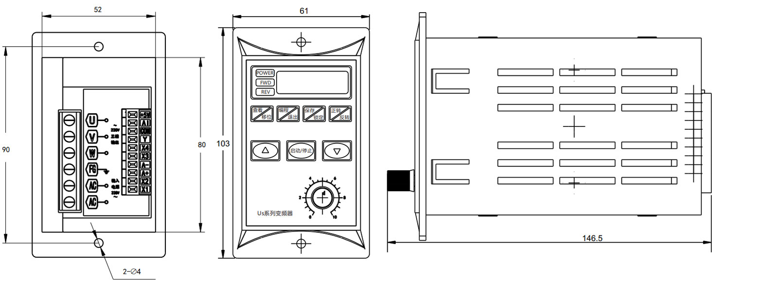 US-3/5系列變頻器體積小,安裝方便;調試簡單,參數(shù)簡潔易懂,能夠滿足普通場合的要求,是專門針對220V/0.75KW以下的三相交流電機量身定做的,為設備制造業(yè)廣大客戶提供一體化解決方案,對降低系統(tǒng)成本,及提高系統(tǒng)可靠性具有很高價值。