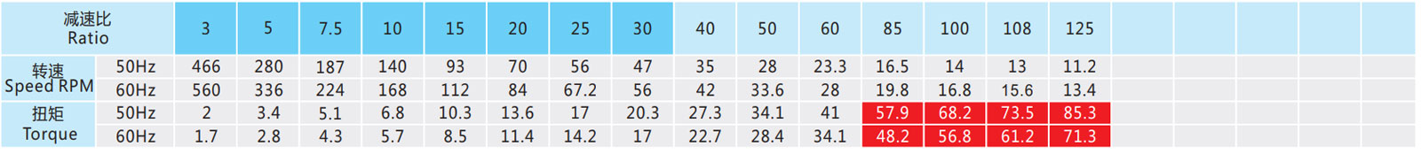 ▲ 表列轉(zhuǎn)速是基于電機(jī)異步轉(zhuǎn)速(50Hz:1400r/min、60Hz:1680r/min),額定負(fù)載時(shí),實(shí)際轉(zhuǎn)速為表列轉(zhuǎn)速的80%-98%。
