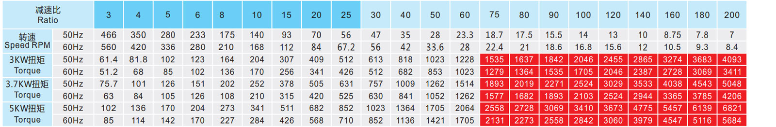 ▲ 表列轉(zhuǎn)速是基于電機(jī)異步轉(zhuǎn)速(50Hz:1400r/min、60Hz:1680r/min),額定負(fù)載時(shí),實(shí)際轉(zhuǎn)速為表列轉(zhuǎn)速的80%-98%。