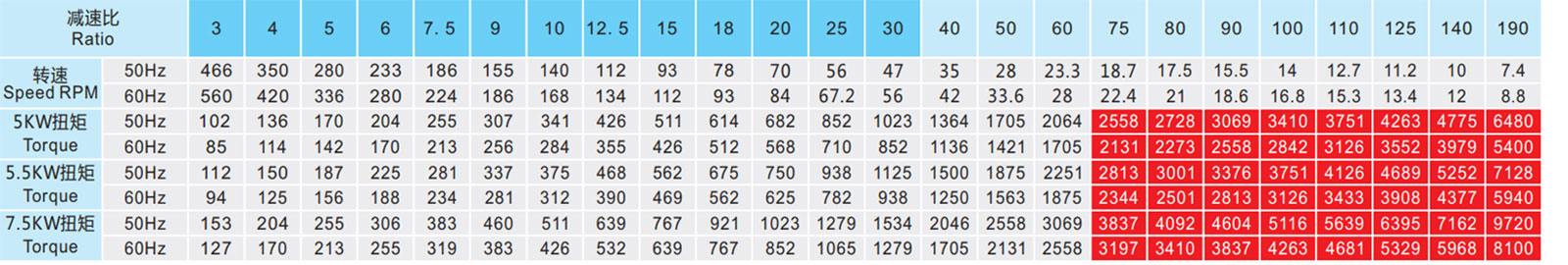 ▲ 表列轉(zhuǎn)速是基于電機異步轉(zhuǎn)速(50Hz:1400r/min、60Hz:1680r/min),額定負載時,實際轉(zhuǎn)速為表列轉(zhuǎn)速的80%-98%。